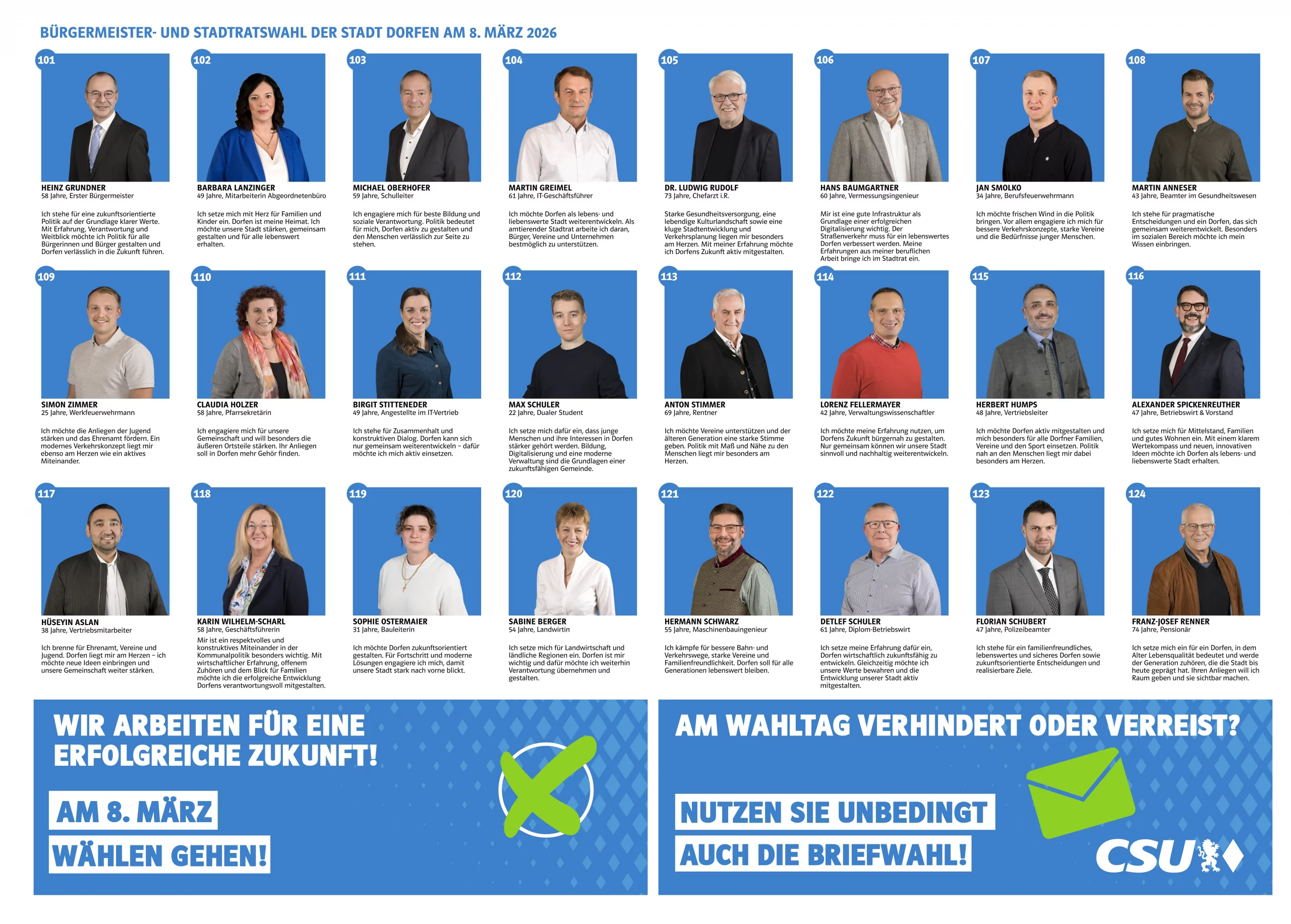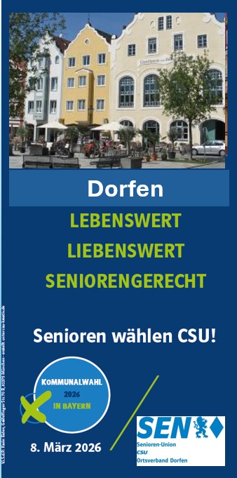 Die CSU Senioren-Union Dorfen (SEN) unterstützt geschlossen die Kandidatur der 24 CSU-Bewerber für die Stadtratswahl am 08.03.2026. Besonders unterstützt sie ihre beiden eigenen Kandidaten, Anton Stimmer und Franz Josef Renner. Anton Stimmer steht für langjährige Erfahrung im Stadtrat und in mehreren Ausschüssen. Das Hauptanliegen von Franz Josef Renner, Gründer und Vorsitzender der SEN ist, gemeinsame Arbeitsstrukturen auszubauen, in Kooperation der SEN mit der Gemeinde und den Betreuungseinrichtungen, die für Senioren von Bedeutung sind.